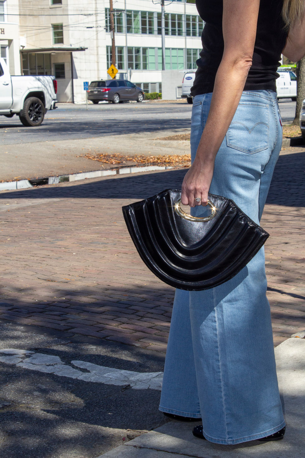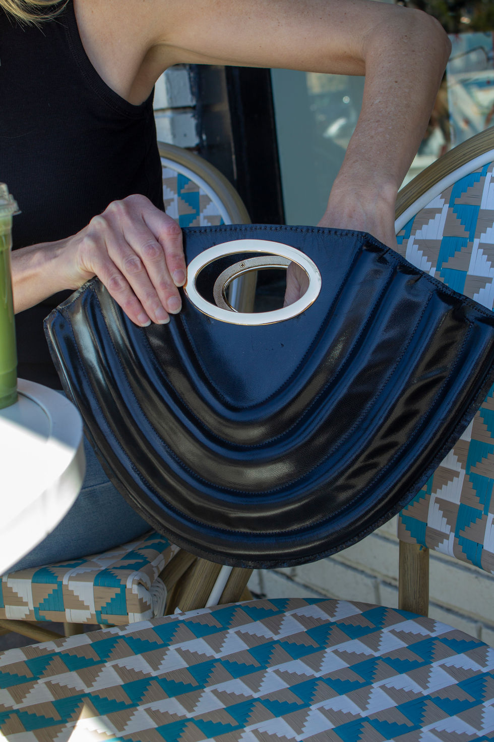 Handmade clutch handbag with a focus on curved forms. Made of dyed veg tan, black kid skin, and 20 mm half circle EVA foam dowels. Created by gluing one dowel on top of the veg tan, covering it with the kid skin, sewing along the dowel, then gluing another next to it and repeating. Implemented a mix of hand and machine sewing.