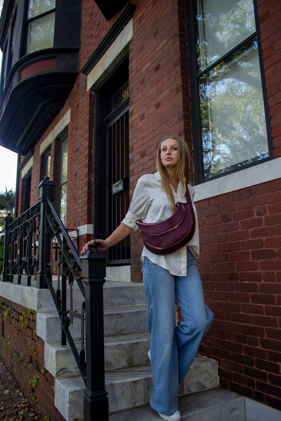 Handmade leather bag focusing on incorporating hardware into curved forms. Created a paneled curved bag with zippers along the seams between each panel. Inner lining is also paneled allowing each zipper to open into the handbag.