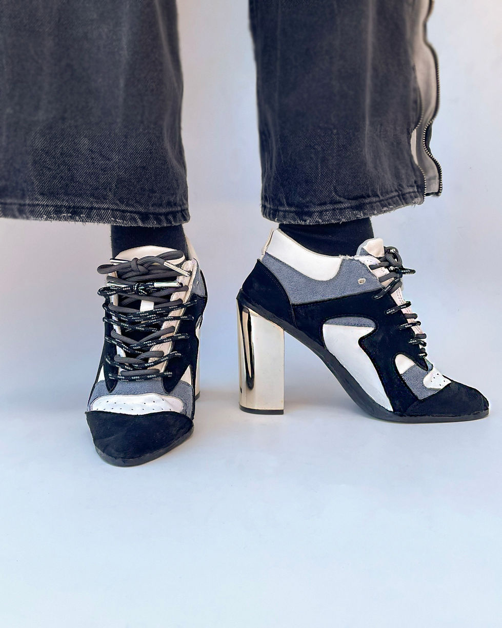 Created using two thrifted pairs of sneakers and a thrifted pair of knee high boots. The upper is a combo of the sneakers, double laced with two shoe laces, and using fabric from the boot to create a new toe box.